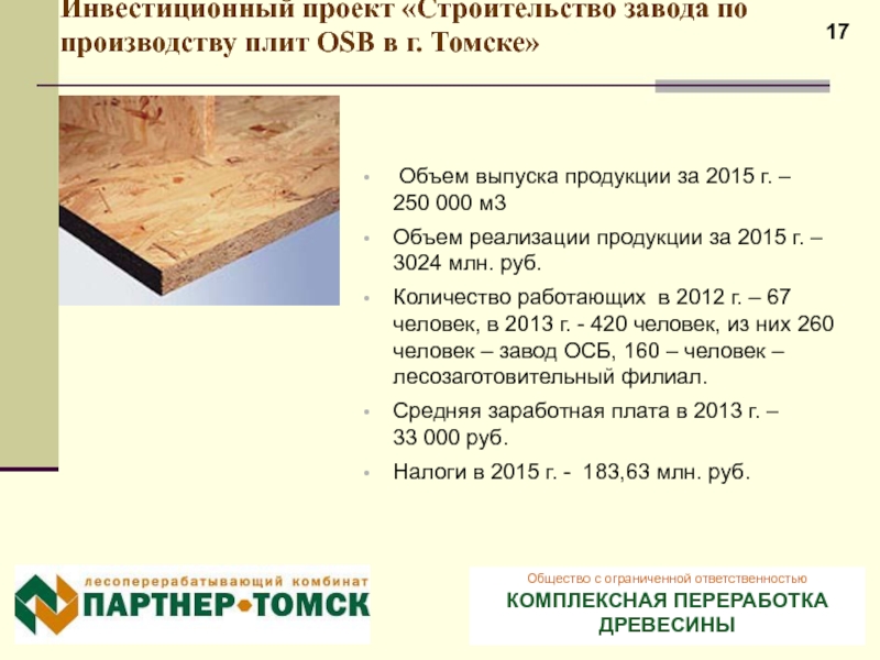 Количество работающих в 2012 г. – 67 человек, в 2013 г. - 420 человек, из них 260 человек – завод ОСБ, 160 – человек – лесозаготовительный филиал.