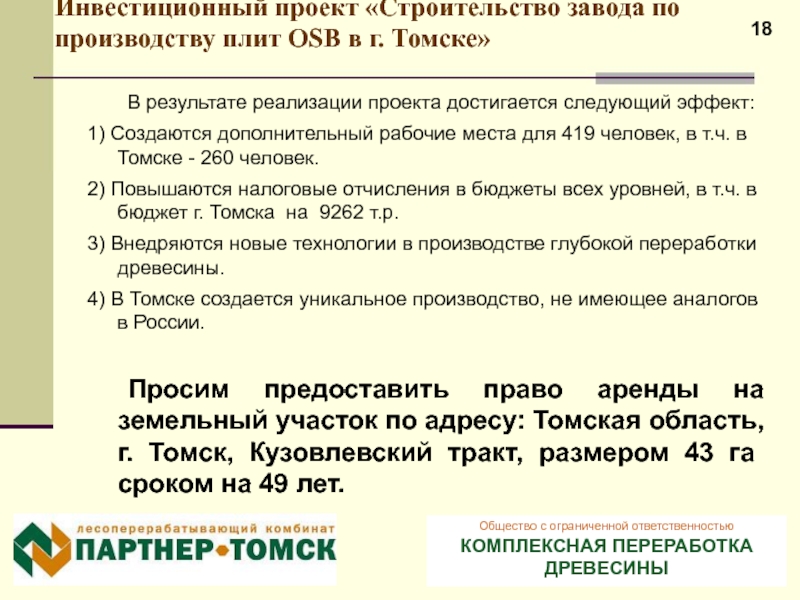 Просим предоставить право аренды на земельный участок по адресу: Томская область, г. Томск, Кузовлевский тракт, размером 43 га сроком на 49 лет.