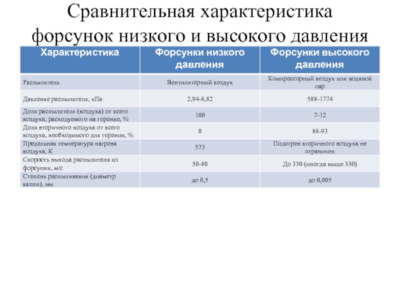 Слайд 6Сравнительная характеристика форсунок низкого и высокого давления