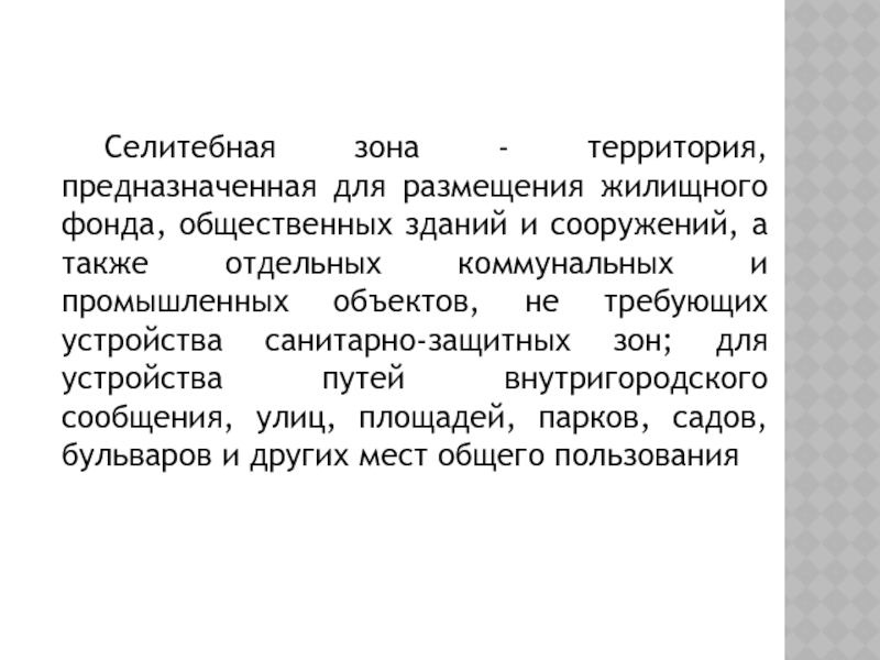 Слайд 9Селитебная зона - территория, предназначенная для размещения жилищного фонда, общественных зданий