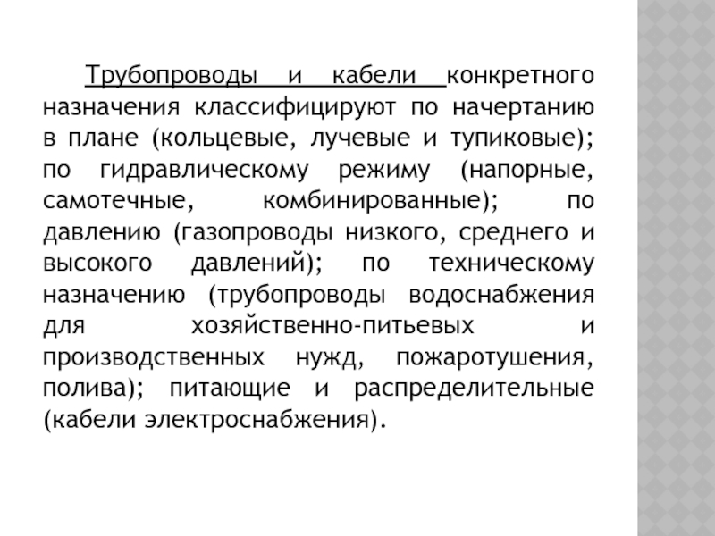 Слайд 25Трубопроводы и кабели конкретного назначения классифицируют по начертанию в плане (кольцевые,