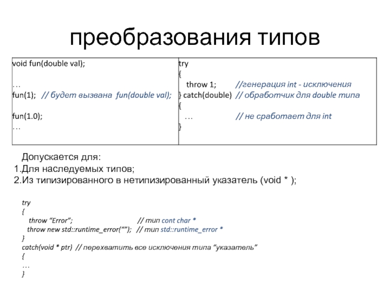 } catch(int errNum) // попали в обработчик исключения типа int