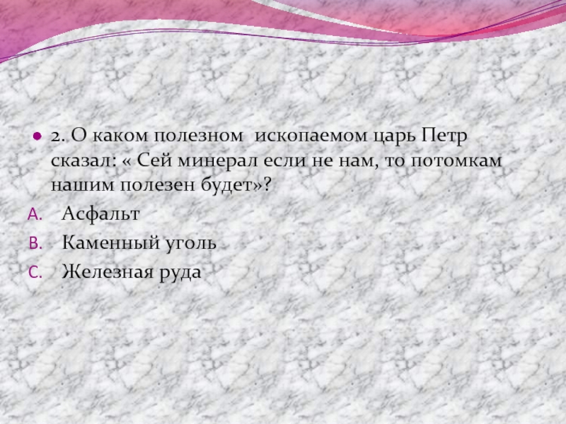 2. О каком полезном ископаемом царь Петр сказал: « Сей минерал