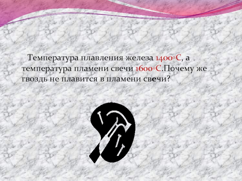 Слайд 42 Температура плавления железа 1400◦С, а температура пламени свечи
