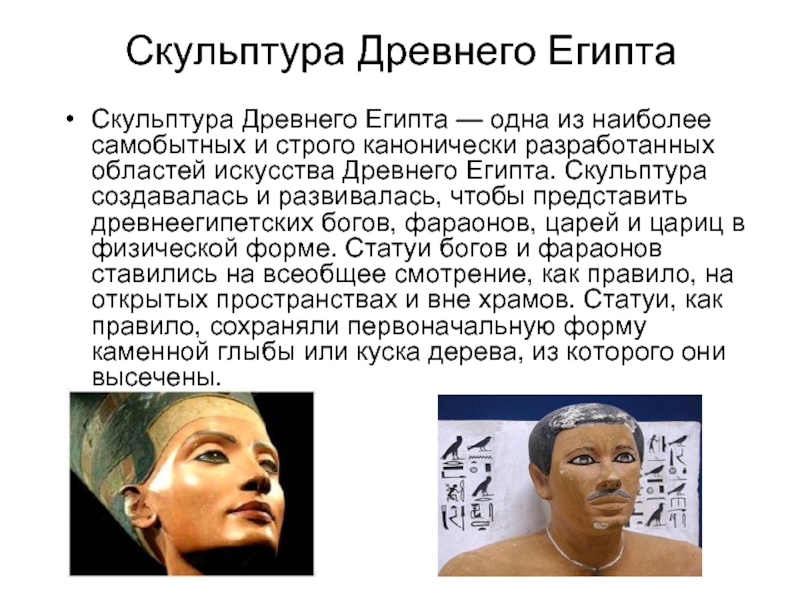 строго канонически разработанных областей искусства Древнего Египта. Скульптура создавалась и развивалась, чтобы представить древнеегипетских богов, фараонов, царей и цариц в физической форме. Статуи богов и фараонов ставились на всеобщее смотрение, как правило, на открытых пространствах и вне храмов. Статуи, как правило, сохраняли первоначальную форму каменной глыбы или куска дерева, из которого они высечены.
