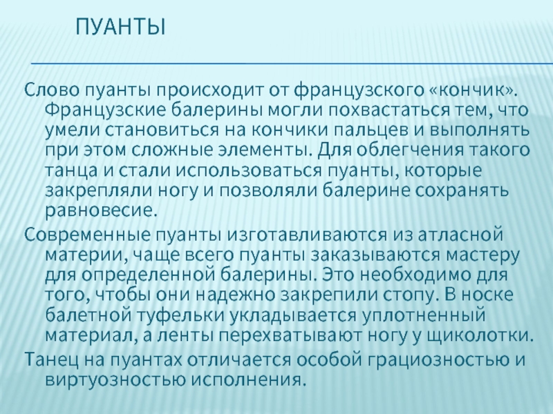 что умели становиться на кончики пальцев и выполнять при этом сложные элементы. Для облегчения такого танца и стали использоваться пуанты, которые закрепляли ногу и позволяли балерине сохранять равновесие.