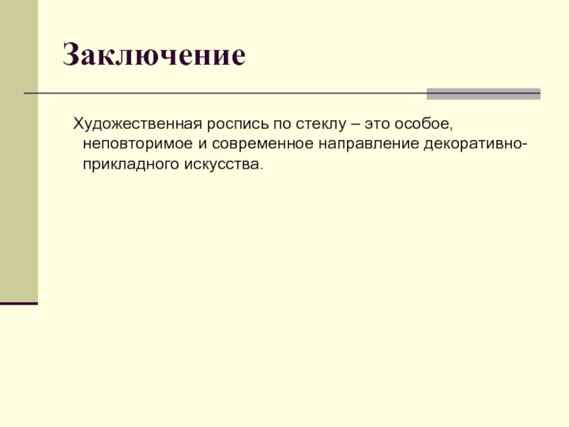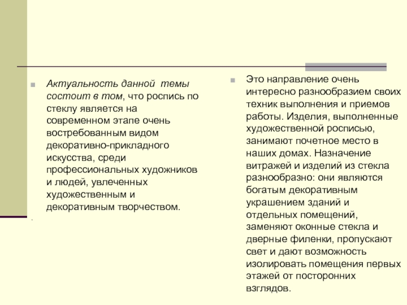 Это направление очень интересно разнообразием своих техник выполнения и приемов работы. Изделия, выполненные художественной росписью, занимают почетное место в наших домах. Назначение витражей и изделий из стекла разнообразно: они являются богатым декоративным украшением зданий и отдельных помещений, заменяют оконные стекла и дверные филенки, пропускают свет и дают возможность изолировать помещения первых этажей от посторонних взглядов.