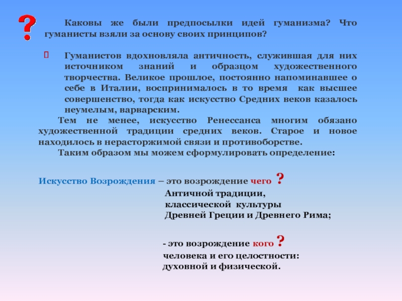 Каковы же были предпосылки идей гуманизма? Что гуманисты взяли за основу своих принципов?