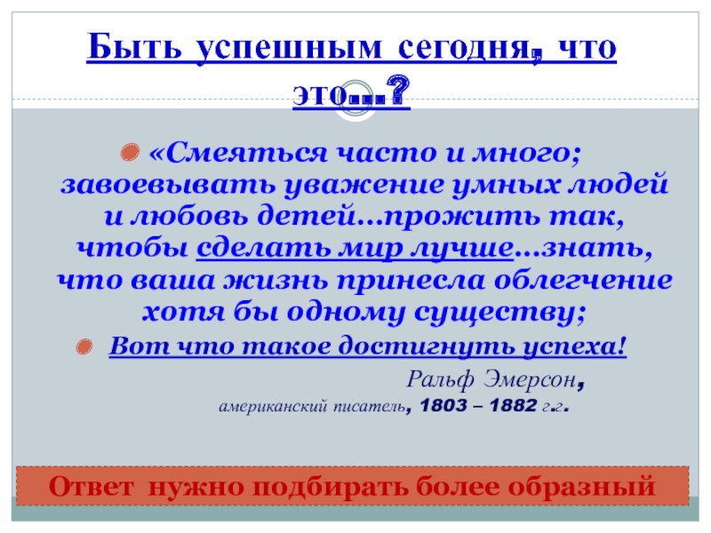 людей и любовь детей…прожить так, чтобы сделать мир лучше…знать, что ваша жизнь принесла облегчение хотя бы одному существу;