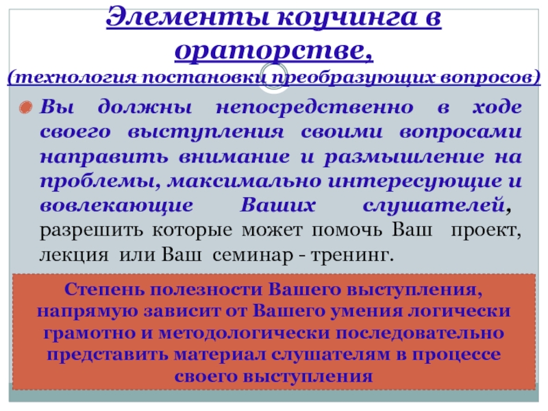 своего выступления своими вопросами направить внимание и размышление на проблемы, максимально интересующие и вовлекающие Ваших слушателей, разрешить которые может помочь Ваш проект, лекция или Ваш семинар - тренинг.