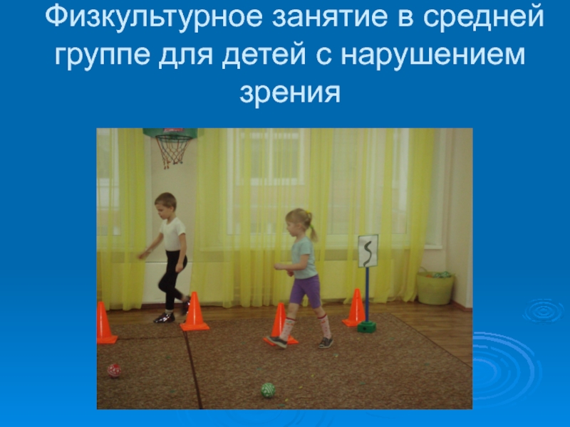 Слайд 5Физкультурное занятие в средней группе для детей с нарушением зрения