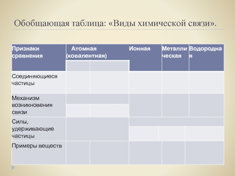 Слайд 14Обобщающая таблица: «Виды химической связи».
