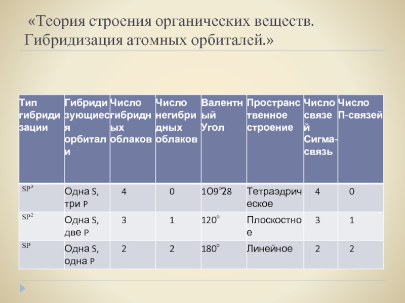 Слайд 11 «Теория строения органических веществ. Гибридизация атомных орбиталей.»