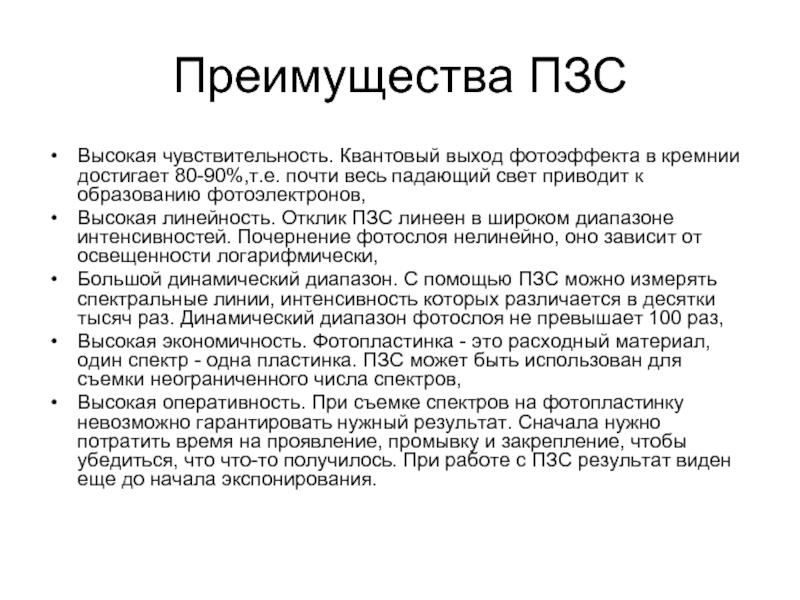 Большой динамический диапазон. С помощью ПЗС можно измерять спектральные линии, интенсивность которых различается в десятки тысяч раз. Динамический диапазон фотослоя не превышает 100 раз,
