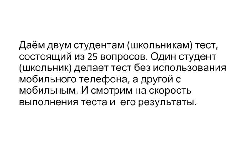 (школьник) делает тест без использования мобильного телефона, а другой с мобильным. И смотрим на скорость выполнения теста и его результаты.