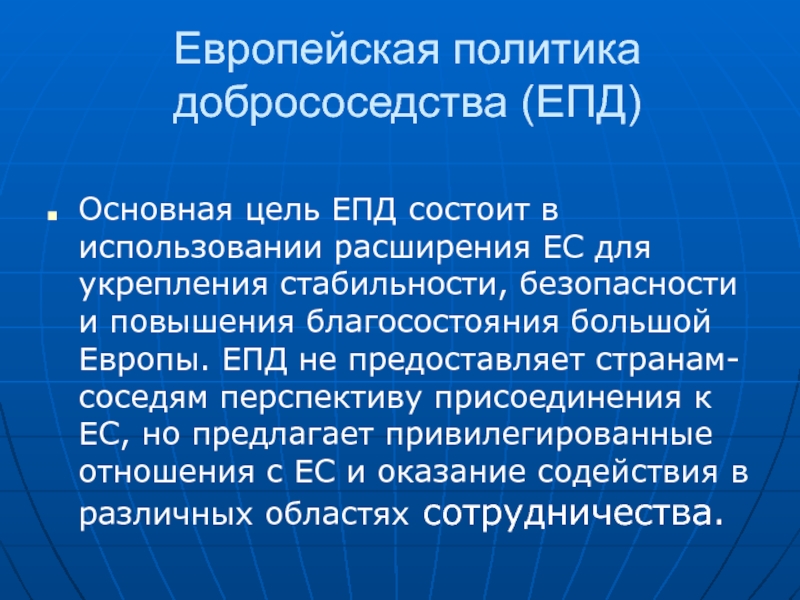 для укрепления стабильности, безопасности и повышения благосостояния большой Европы. ЕПД не предоставляет странам-соседям перспективу присоединения к ЕС, но предлагает привилегированные отношения с ЕС и оказание содействия в различных областях сотрудничества.
