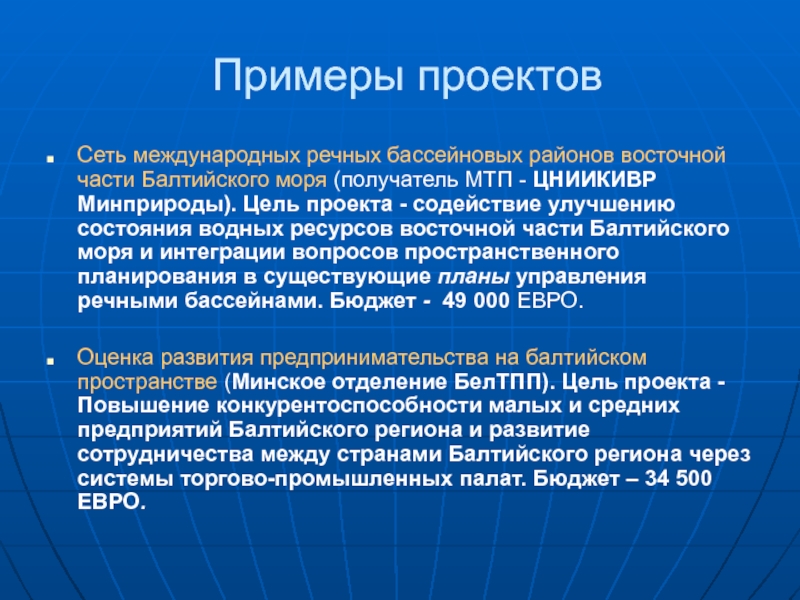 МТП - ЦНИИКИВР Минприроды). Цель проекта - содействие улучшению состояния водных ресурсов восточной части Балтийского моря и интеграции вопросов пространственного планирования в существующие планы управления речными бассейнами. Бюджет - 49 000 ЕВРО.