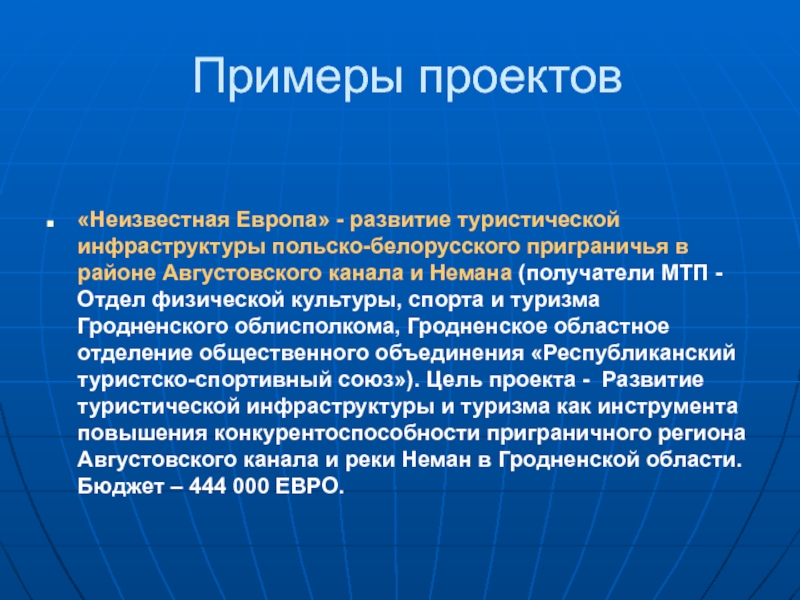 Августовского канала и Немана (получатели МТП - Отдел физической культуры, спорта и туризма Гродненского облисполкома, Гродненское областное отделение общественного объединения «Республиканский туристско-спортивный союз»). Цель проекта - Развитие туристической инфраструктуры и туризма как инструмента повышения конкурентоспособности приграничного региона Августовского канала и реки Неман в Гродненской области. Бюджет – 444 000 ЕВРО.