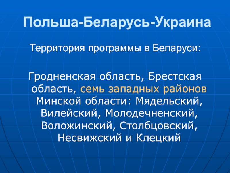 Буг (получатель МТП - Брестский областной комитет природных ресурсов и охраны окружающей среды). Цель проекта - Усиление и расширение польско-белорусско-украинского сотрудничества в управлении водными ресурсами в бассейне реки Буг. Бюджет – 65 140 ЕВРО.