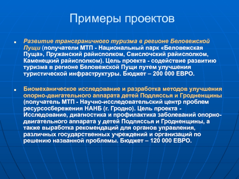 Национальный парк «Беловежская Пуща», Пружанский райисполком, Свислочский райисполком, Каменецкий райисполком). Цель проекта - содействие развитию туризма в регионе Беловежской Пущи путем улучшения туристической инфраструктуры. Бюджет – 200 000 ЕВРО.