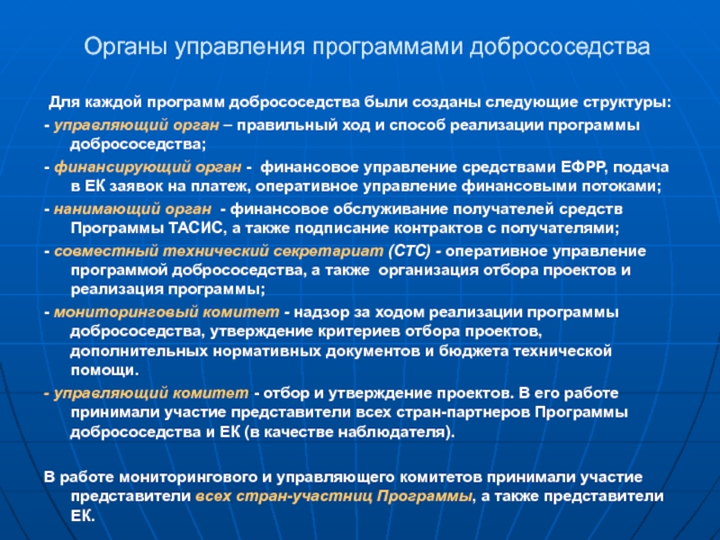 - управляющий орган – правильный ход и способ реализации программы добрососедства;