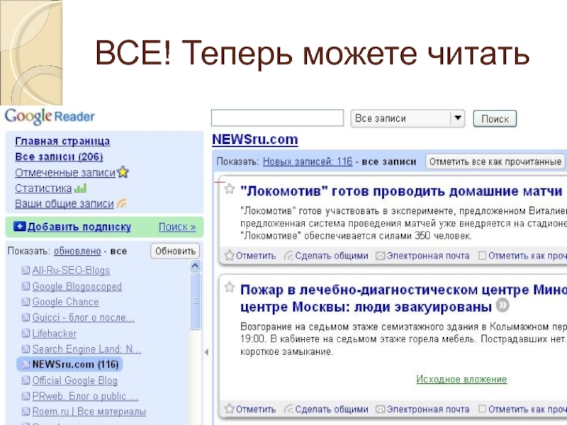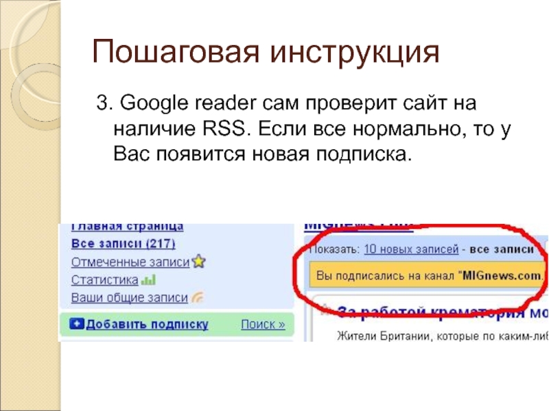 Слайд 12Пошаговая инструкция работы с google reader