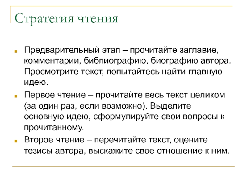 Первое чтение – прочитайте весь текст целиком (за один раз, если возможно). Выделите основную идею, сформулируйте свои вопросы к прочитанному.