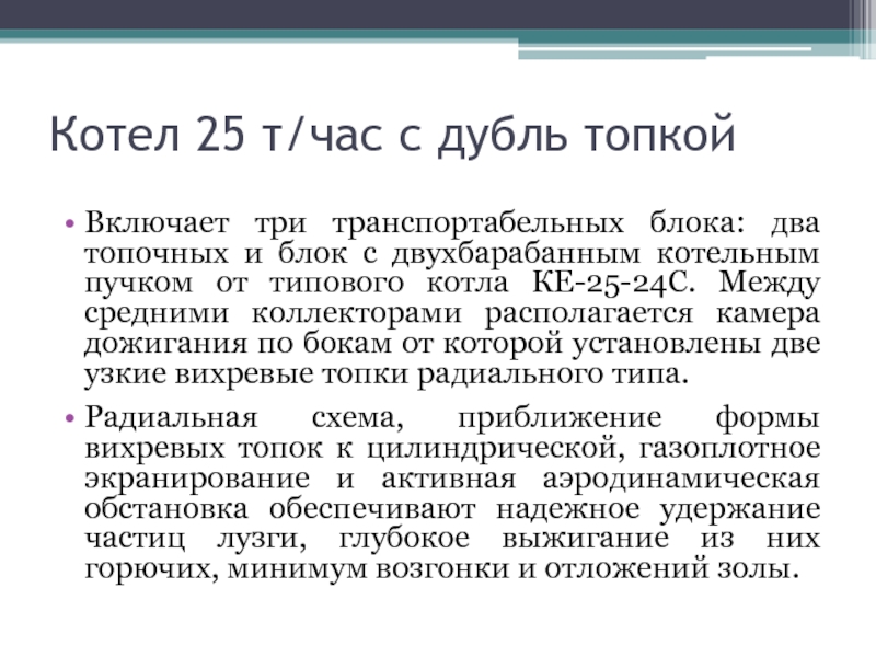и блок с двухбарабанным котельным пучком от типового котла КЕ-25-24С. Между средними коллекторами располагается камера дожигания по бокам от которой установлены две узкие вихревые топки радиального типа.