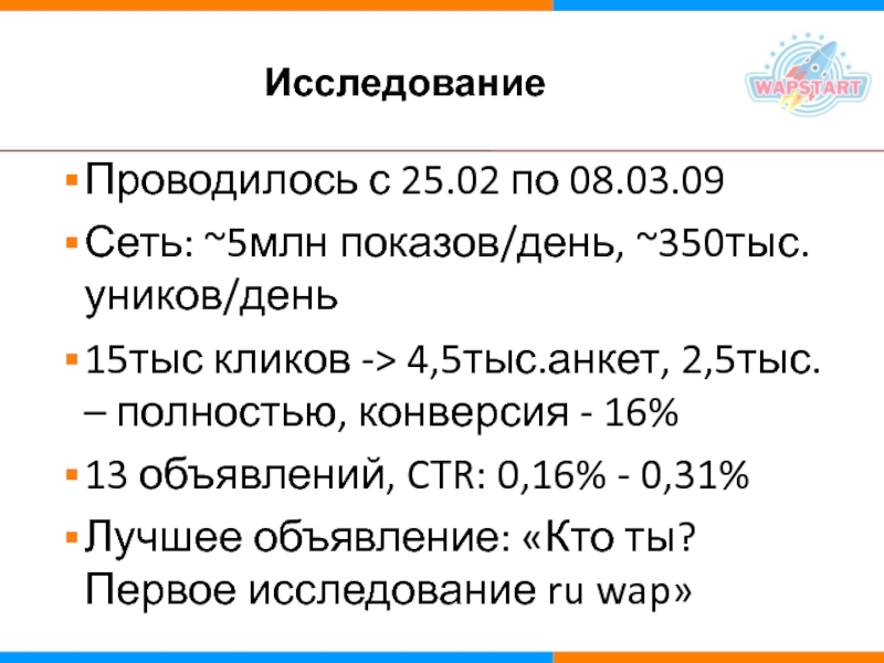 Слайд 11Исследование аудитории рекламной сети Wapstart