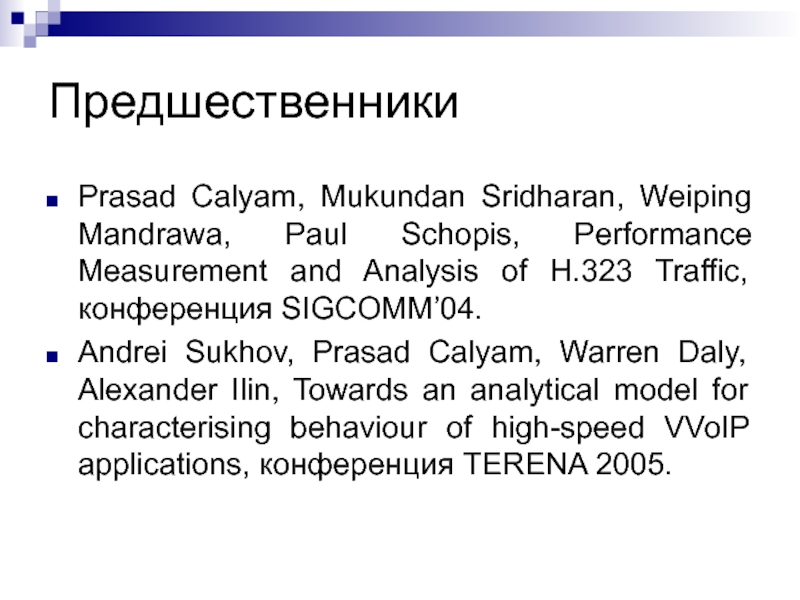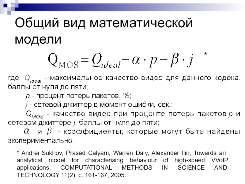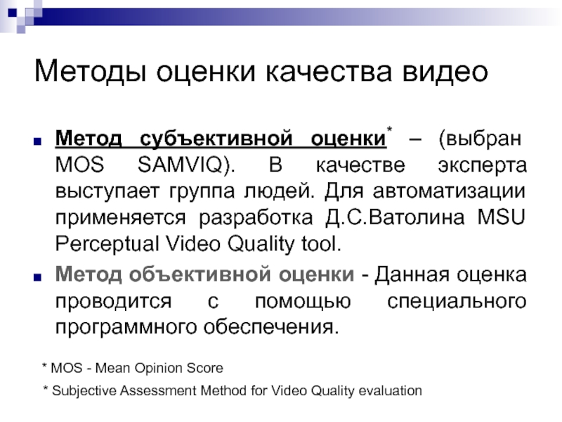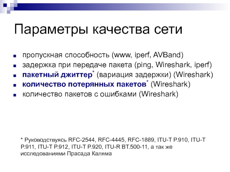 * Руководствуясь RFC-2544, RFC-4445, RFC-1889, ITU-T P.910, ITU-T P.911, ITU-T P.912, ITU-T P.920, ITU-R BT.500-11, а так же исследованиями Прасада Каляма