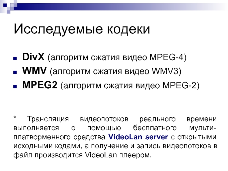* Трансляция видеопотоков реального времени выполняется с помощью бесплатного мульти-платворменного средства VideoLan server с открытыми исходными кодами, а получение и запись видеопотоков в файл производится VideoLan плеером.
