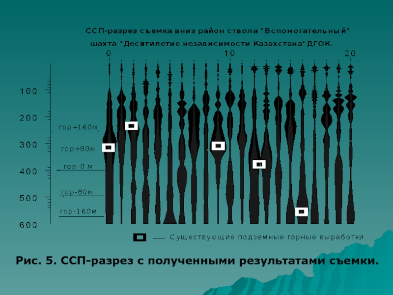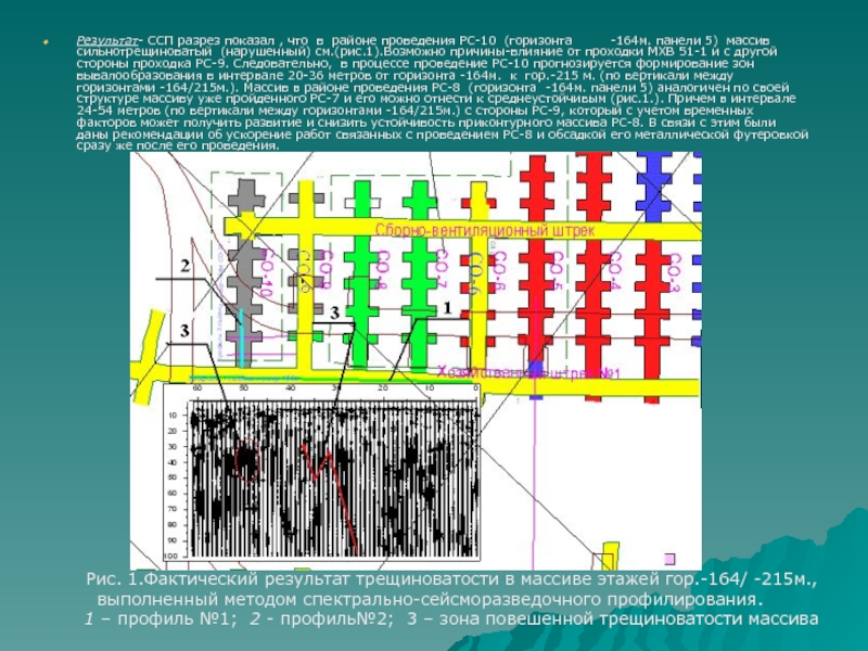 Рис. 1.Фактический результат трещиноватости в массиве этажей гор.-164/ -215м., выполненный методом спектрально-сейсморазведочного профилирования.