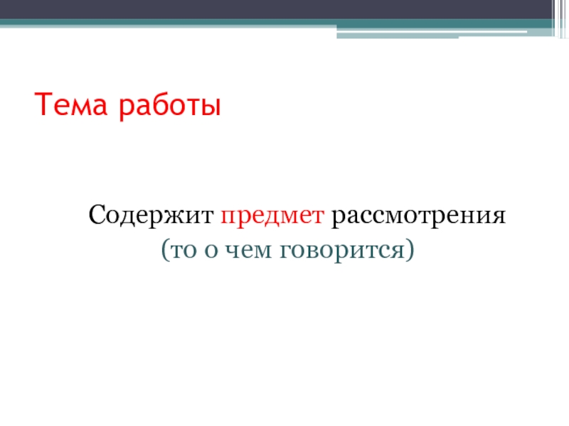 Предмет — это то, что находится в рамках, в границах объекта, тот аспект проблемы, исследуя который, мы познаем целостный объект, выделяя его главные, наиболее существенные признаки. Предметом исследования могут быть явления в целом, отдельные их стороны, аспекты и отношения между отдельными сторонами и целым (совокупность элементов, связей, отношений в конкретной области объекта). Именно предмет исследования определяет тему работы.
