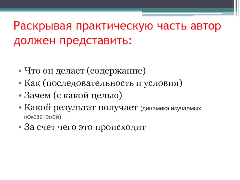 Слайд 24Раскрывая практическую часть автор должен представить: