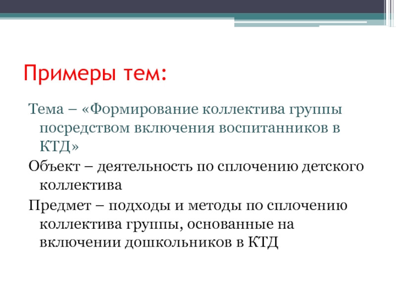 Слайд 20Тема: Формирование коллектива группы посредством включения воспитанников в КТД