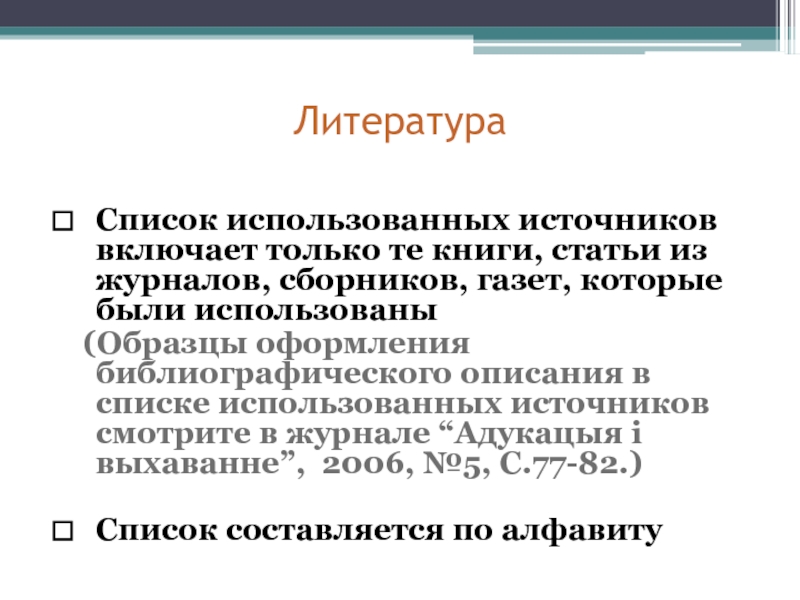 (Образцы оформления библиографического описания в списке использованных источников смотрите в журнале “Адукацыя і выхаванне”, 2006, №5, С.77-82.)