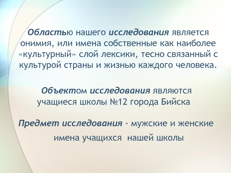 Предмет исследования - мужские и женские имена учащихся нашей школы