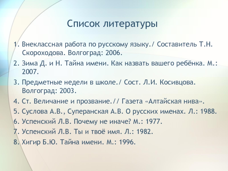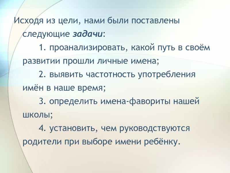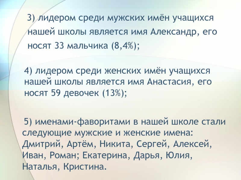 5) именами-фаворитами в нашей школе стали следующие мужские и женские имена: Дмитрий, Артём, Никита, Сергей, Алексей, Иван, Роман; Екатерина, Дарья, Юлия, Наталья, Кристина.
