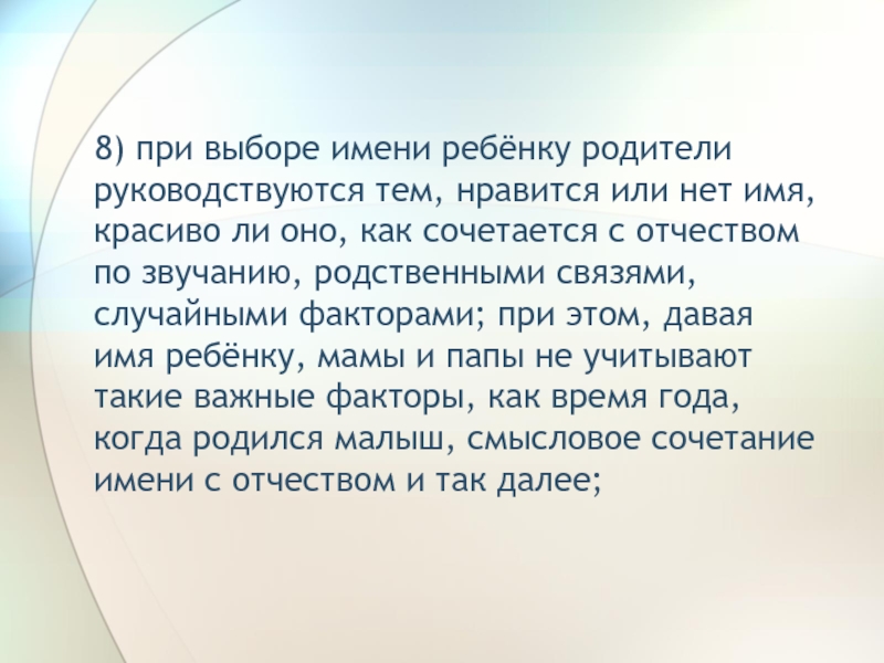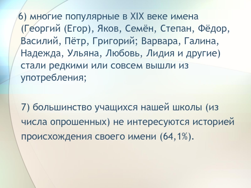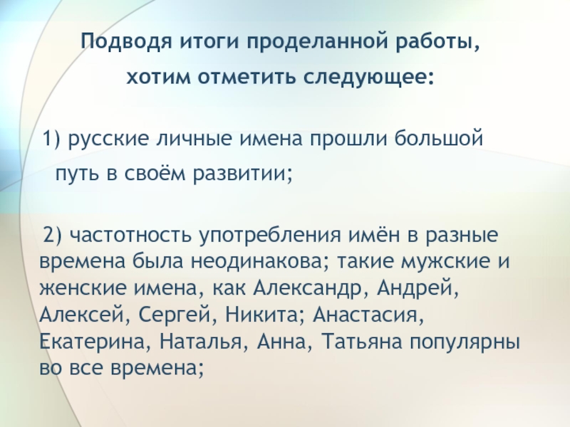 2) частотность употребления имён в разные времена была неодинакова; такие мужские и женские имена, как Александр, Андрей, Алексей, Сергей, Никита; Анастасия, Екатерина, Наталья, Анна, Татьяна популярны во все времена;