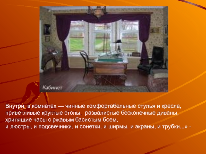 Внутри, в комнатах — чинные комфортабельные стулья и кресла,