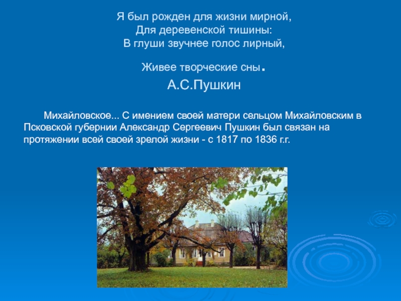 Михайловское... С имением своей матери сельцом Михайловским в Псковской губернии Александр Сергеевич Пушкин был связан на протяжении всей своей зрелой жизни - с 1817 по 1836 г.г.