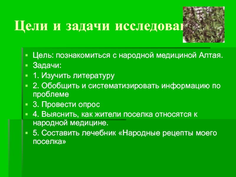 Цель: познакомиться с народной медициной Алтая.