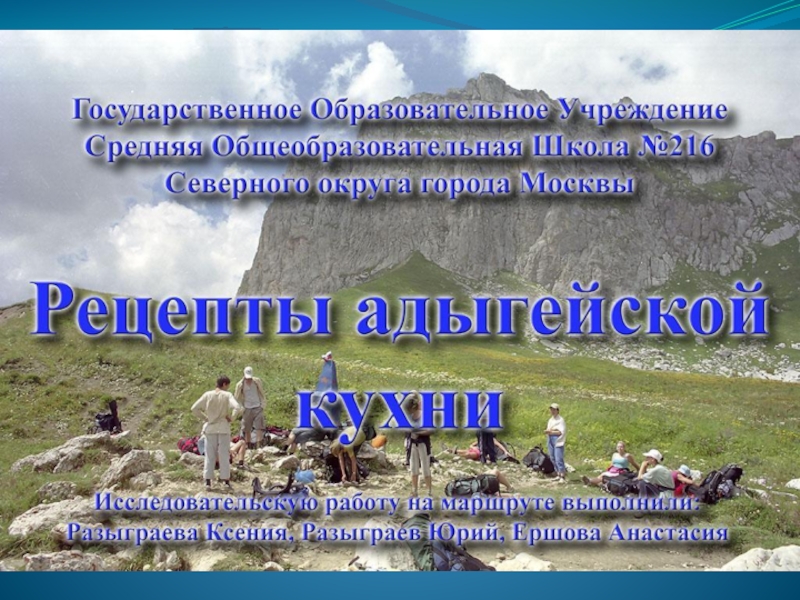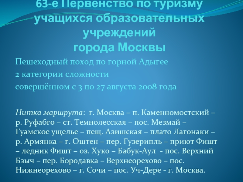 Нитка маршрута: г. Москва – п. Каменномостский – р. Руфабго – ст. Темнолесская – пос. Мезмай – Гуамское ущелье – пещ. Азишская – плато Лагонаки – р. Армянка – г. Оштен – пер. Гузерипль – приют Фишт – ледник Фишт – оз. Хуко – Бабук-Аул - пос. Верхний Бзыч – пер. Бородавка – Верхнеорехово – пос. Нижнеорехово – г. Сочи – пос. Уч-Дере - г. Москва.