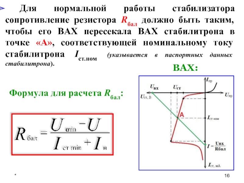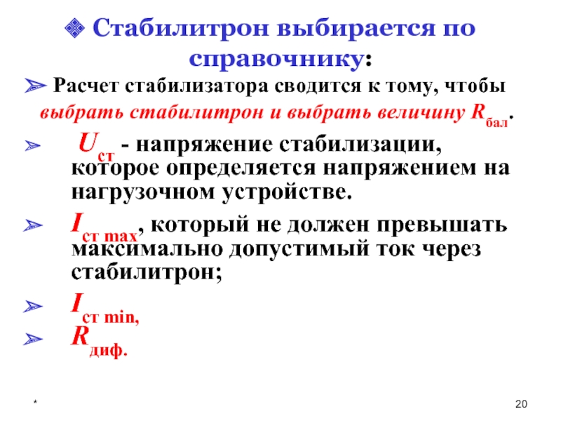 Расчет стабилизатора сводится к тому, чтобы выбрать стабилитрон и выбрать величину Rбал.