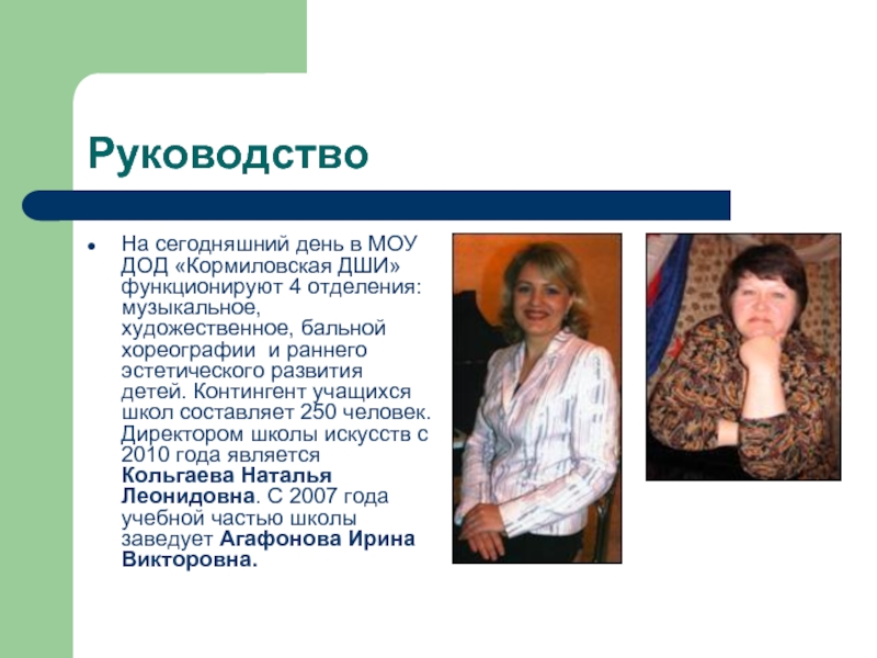 музыкальное, художественное, бальной хореографии и раннего эстетического развития детей. Контингент учащихся школ составляет 250 человек. Директором школы искусств с 2010 года является Кольгаева Наталья Леонидовна. С 2007 года учебной частью школы заведует Агафонова Ирина Викторовна.