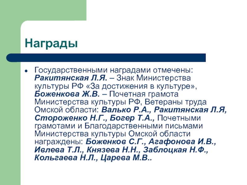 достижения в культуре», Боженкова Ж.В. – Почетная грамота Министерства культуры РФ, Ветераны труда Омской области: Валько Р.А., Ракитянская Л.Я, Стороженко Н.Г., Богер Т.А., Почетными грамотами и Благодарственными письмами Министерства культуры Омской области награждены: Боженков С.Г., Агафонова И.В., Ивлева Т.Л., Князева Н.Н., Заблоцкая Н.Ф., Кольгаева Н.Л., Царева М.В..