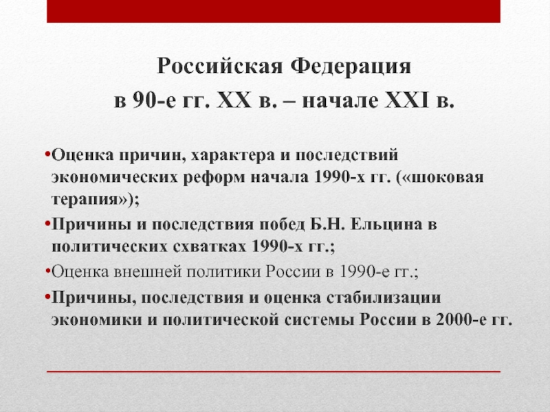 причин, характера и последствий экономических реформ начала 1990-х гг. («шоковая терапия»);