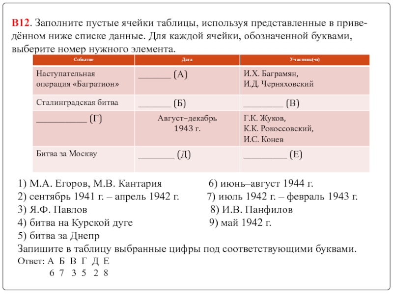 Слайд 6В12. Заполните пустые ячейки таблицы, используя представленные в приве-дённом ниже списке