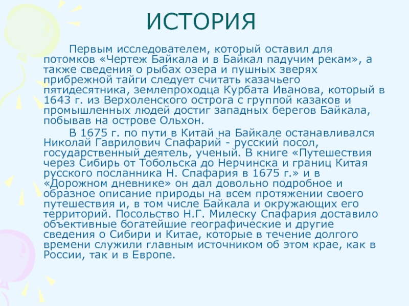 В 1675 г. по пути в Китай на Байкале останавливался Николай Гаврилович Спафарий - русский посол, государственный деятель, ученый. В книге «Путешествия через Сибирь от Тобольска до Нерчинска и границ Китая русского посланника Н. Спафария в 1675 г.» и в «Дорожном дневнике» он дал довольно подробное и образное описание природы на всем протяжении своего путешествия и, в том числе Байкала и окружающих его территорий. Посольство Н.Г. Милеску Спафария доставило объективные богатейшие географические и другие сведения о Сибири и Китае, которые в течение долгого времени служили главным источником об этом крае, как в России, так и в Европе.