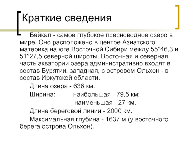 в центре Азиатского материка на юге Восточной Сибири между 55°46,3 и 51°27,5 северной широты. Восточная и северная часть акватории озера административно входят в состав Бурятии, западная, с островом Ольхон - в состав Иркутской области.